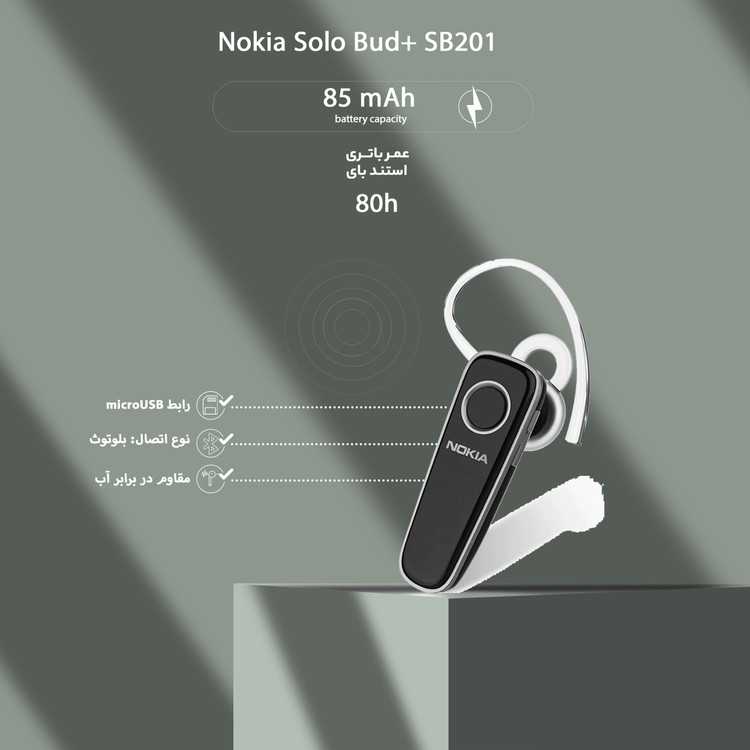 زمانی که خارج از منزل هستید یا در هنگام رانندگی، نیاز به یک هدفون قوی و خوش ساخت دارید تا بتوانید به امور تلفنی خود برسید. هدفون بی سیم نوکیا مدل Solo Bud+ SB-201 یکی از محصولات بسیار خوب بازار است. این هدفون جدید نوکیا از نوع تک گوشی و بیسیم بوده و برای بیش از 6 ساعت مکالمه مناسب خواهد بود و علاوه بر آن تا 80 ساعت به حالت استندبای میتواند روشن بماند. میکروفن این هدفون نویزهای پس زمینه را از بین میبرد بنابراین در هنگام مکالمه یا ضبط صدا نویزهای مزاحم کار شما را مختل نمیکنند. این هدفون دربرابر عرق و رطوبت مقاوم بوده و دارای گواهینامه IPX4 است. بنابراین شما در همه شرایط آبوهوایی نگرانی استفاده از این هدفون را نخواهید داشت. نحوه اتصال این محصول با دستگاهها از طریق بلوتوث است. نسخه بلوتوث این هدفون بلوتوث 5.0 بوده و اتصال بین چندین دستگاه در آن ممکن خواهد شد. وضعیت این هدفون را میتوانید با بررسی نشانگر LED تشخیص بدهید.